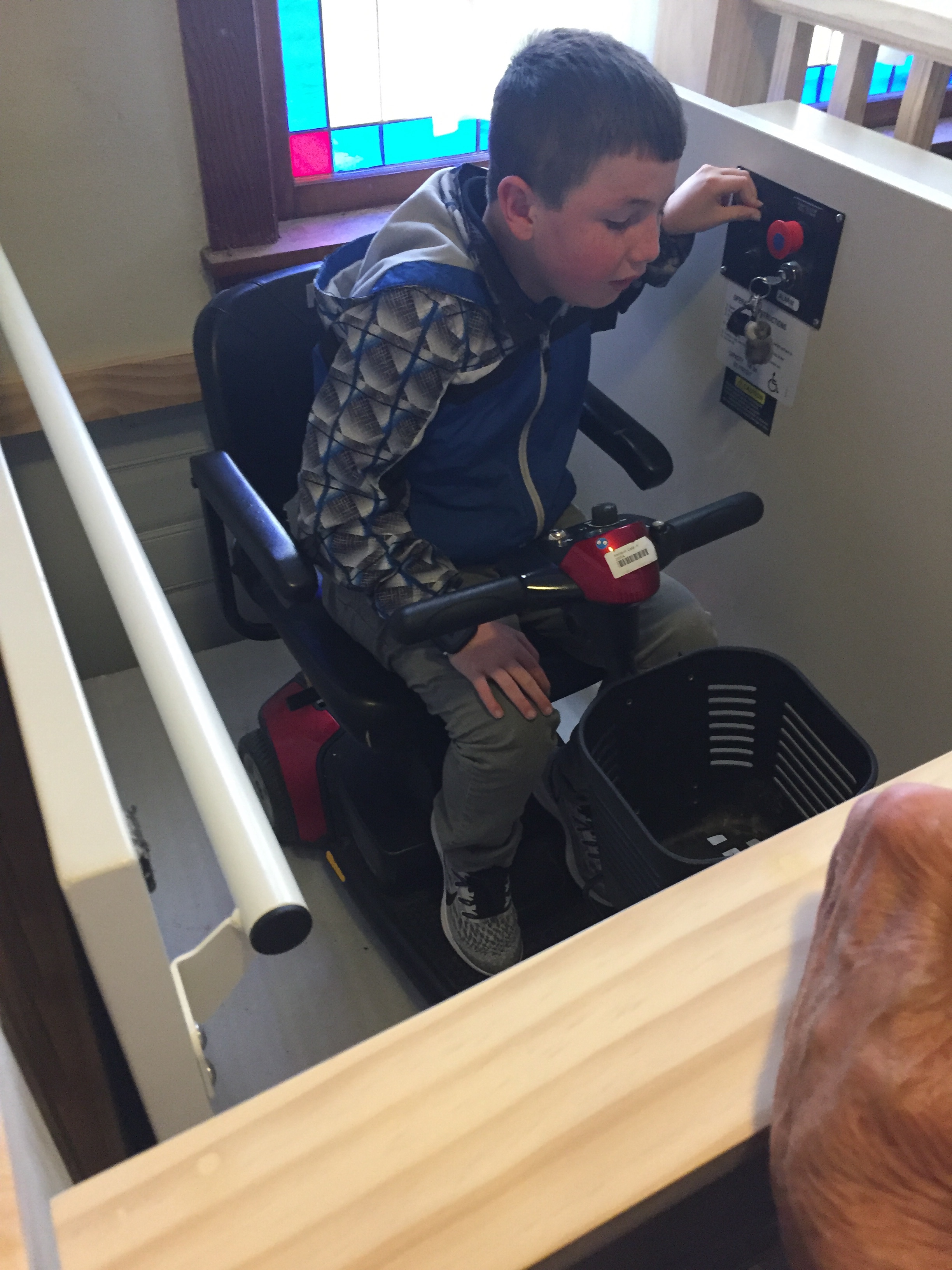 Then the lift at the church was installed and operational. This made the church fully accessible for Cade and others. The bathrooms still need a little work but the major problem of a lift was now taken care of. Cade was so excited to go to church! He now can get around and play with the kids no matter where they go! To the sanctuary, to the basement or outside!!